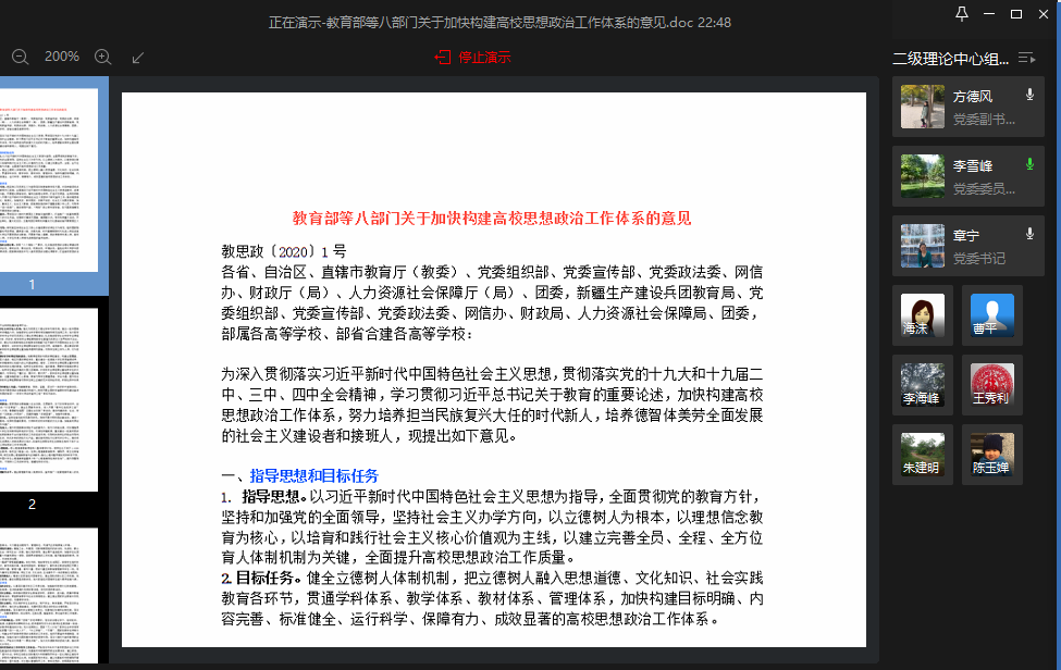大家集中学习了《教育部等八部门关于加快构建高校思想政治工作体系的意见》文件。章宁书记首先对文件精神进行了深刻解读,她指出课程思政和思政课程的重要性和必要性,并强调思政要融入到教学和科研工作中,要发挥辅导员的优势;接着,方德风副书记进行了重点发言,他结合公司和公司的一些实际工作和做法从指导思想和目标任务、构建理论武装体系、构建学科教学体系、构建日常教育体系、构建管理服务体系、构建安全稳定体系、构建队伍建设体系、构建评估督导体系、组织领导和实施保障共九个方面谈了自己的学习体会。他说到,从目标任务描述中,可以看出构建高校思想政治工作体系是一个系统工程,它包括员工在公司、社会学习生活的各个环节,包括了公司在教学、科研、管理、服务的各个方面,完成文件规定的目标需要真正构建公司、公司的大思政格局,并说到公司要充分发挥课堂主渠道作用,引导广大教师守好讲台主阵地,将立德树人放在首要位置,融入渗透到公司产品全过程,以心育心、以德育德、以人格育人格。通过设立课程思政公司培育项目等方式把课程思政做好,充分发挥好教学育人的作用。同时,他还提到要提高新媒体在高校思想政治工作中的重要作用,加强员工社团建设,配齐配好员工指导教师,要建立辅导员发展的长效机制。