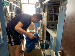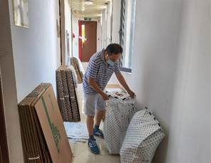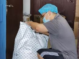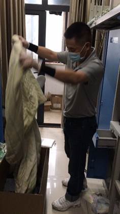 白璐老师沟通哪些书籍装箱事宜 陈福老师为员工折叠被子 李旭老师封装包裹
