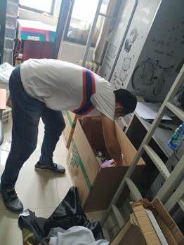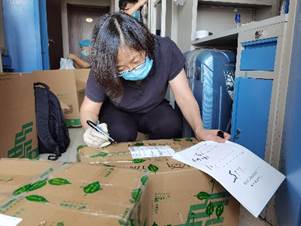 李日飞老师分类装箱 范丹老师包装易脏物品 王天梅老师仔细核验每份材料