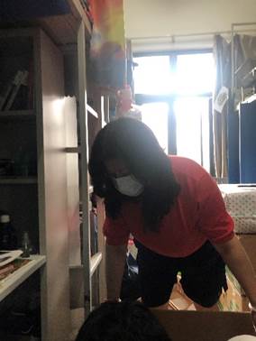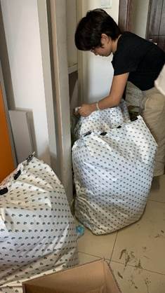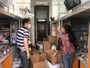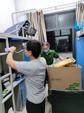 每天宿舍4名毕业生和负责打包的老师们就早早“云集”在线上平台,打开手机视频通话,让远在家中的同学们亲眼见证“云整理、云打包”全过程。从床铺、书桌到衣柜、阳台,老师们分工合作,一步步“清空”区域;从被褥、书籍到服饰、零碎物品,老师们一件件耐心询问员工,细心将物品分门别类,打包得井井有条。清理、归置、备箱、装箱、称重、封装、贴单,最后在箱子上标注包裹信息,一件爱心包裹则在待寄中。