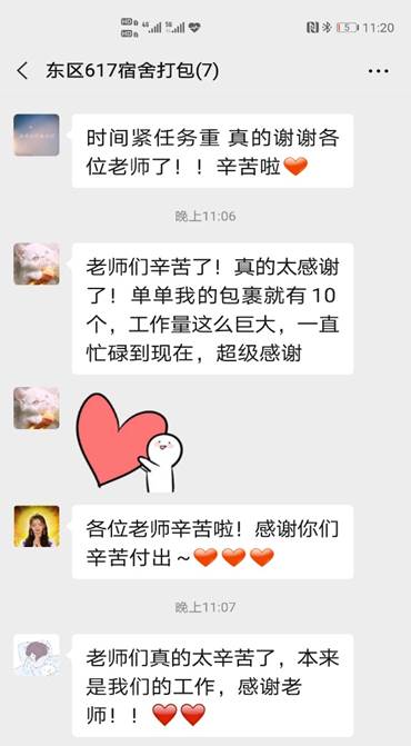 炎炎夏日,这一箱箱的行李背后承载的是满满的汗水和感动。长弯腰,搬重物,从清晨到傍晚,即使汗流浃背,即使腰酸背痛,老师们也毫不懈怠。有的老师主动承担搬运行李的重任,背上早早贴上了膏药贴;有的老师打包过程中与熟悉的员工视频,视频对面的同学们感慨“毕业前再见最后一眼,看一眼宿舍,再看一眼老师”;有的老师连续打包将近十五小时,中途仅仅出去匆匆吃了顿午餐,“梦里都在打包行李”,老师笑道:“现在摇身一变快递小哥,精准快稳”。“连续直播打包十几个小时,手机电量都比以前掉得快多了”老师举着电量不足的手机打趣道。动作越来越快,配合越来越熟练。短短几天内,老师们练就了媲美双十一期间打包员的工作能力。游刃有余的工作背后,是老师们额前细密的汗水、日趋疼痛的腰背和早出晚归的疲惫。保质保量的完成背后,是老师们欣慰开心的笑容、不负重托的感动和毕业祝福的点赞。