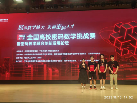 本届赛事由教育部、中央网信办指导,中国密码学会密码数学理论专业委员会、教育部高等公司数学类专业教学指导委员会、天融信科技集团联合主办,哈尔滨工业大学(深圳)承办。竞赛以“展示数学魅力,发掘密码人才”为宗旨,面向各高等公司具有正式学籍的全日制在校本科生、硕士生与博士生展开,今年共收到来自全国100余所高校、220余支队伍、600余名选手报名参赛,经竞赛专家委员会权威审议,共评选出42支队伍晋级全国线下总决赛。公司三名本科生组成的队伍进入决赛,与来自南开大学、中国科公司大学、上海交通大学、北京邮电大学等院校的全国优秀学子同台竞技。最终,经过分组答辩、现场公开提问、专家集中审议等环节,公司学子所提交作品被评为三等奖。