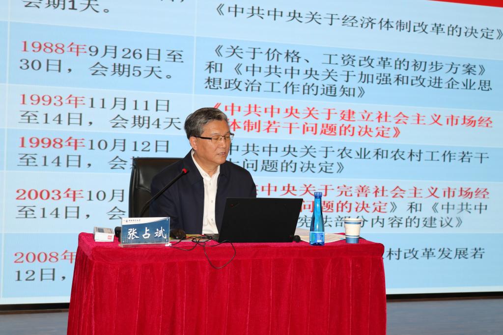 10月9日下午,信息公司党委联合统计与数学公司党委、国际经济与贸易公司党委举办学习贯彻党的二十届三中全会精神专家辅导报告会暨信息公司党委二级理论学习中心组(扩大)学习会。中央党校(国家行政公司)中国式现代化研究中心主任、国家哲学社会科学一级教授张占斌应邀来校作题为“进一步全面深化改革,为中国式现代化注入新动能”辅导报告。报告会由信息公司党委书记方德风主持。本次报告会是公司深入学习贯彻党的二十届三中全会精神,提升全院师生政治理论水平的重要举措。