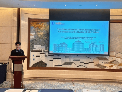 起椿淇同学在数字经济分会场中分享题为The Effect of Virtual Team Characteristics in Co-creation on the Quality of UGC Videos学术论文。该论文研究了UGC视频平台新兴的联合创作模式,基于交互记忆系统和社会资本理论探讨了虚拟团队特征和成员个人特征对视频质量的影响。文章使用了自然语言处理和计量分析方法进行了实证研究,为UGC平台的创作者和管理者优化联合创作行为提供了理论支持。