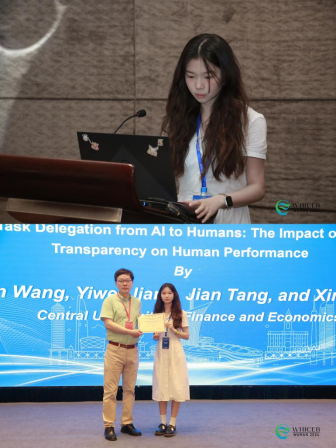 王韵然同学的参会论文“Delegation from AI to Humans: The Impact of AI Transparency on Human Performance”主要基于委托代理理论(Principal-agent theory, PAT),探究了AI委托给人模式下AI透明度对人的任务表现的影响机制。具体来说,研究通过组间实验的方式(AI优势信息vs.AI原理信息vs.无AI信息),探究了透明度对任务表现的直接作用、人的信任和认知不确定性的中介效应。结果表明,呈现AI的原理信息能够提高人完成任务的准确性,AI优势信息使得人更愿意与AI协作并完成更多的任务;认知不确定性完全中介了透明度对人任务表现的影响。这些结果对今后在人机协作中对AI的设计具有启示意义。该论文受到最佳论文奖项提名并获得“Second Nominated Paper”奖项。
